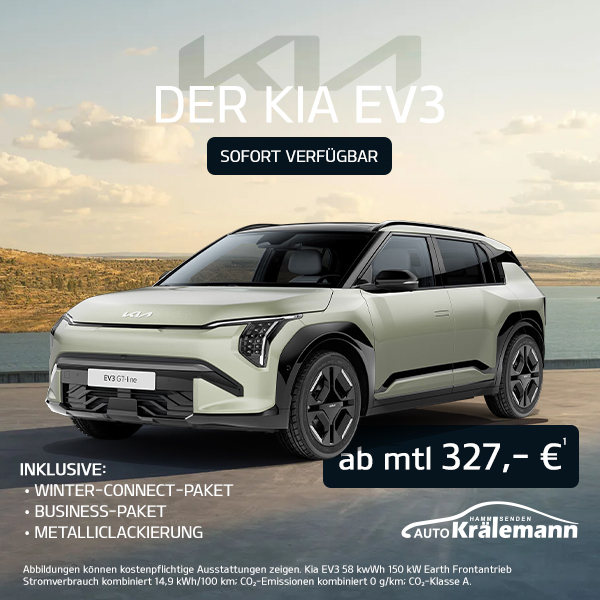 1Ein unverbindliches Leasingbeispiel von KIA Finance, ein Geschäftsbereich der Hyundai Capital Bank Europe GmbH, Friedrich-Ebert-Anlage 35–37, 60327 Frankfurt am Main. Verpflichtung zum Abschluss einer Vollkaskoversicherung. Kostenpflichtige Sonderausstattung möglich. Zzgl. Überführungskosten in Höhe von 1.490,00 EUR und Sonderzahlung in Höhe von 890,00 EUR. Fahrzeugpreis und Leasingsonderzahlung inkl. gesetzlicher MwSt.